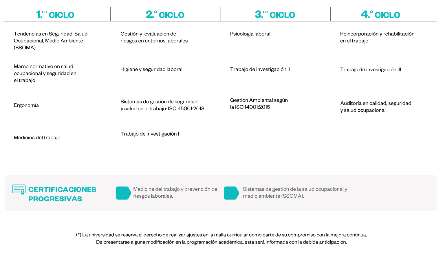 La Maestría en Gestión de la Salud Ocupacional y Prevención del Riesgo Laboral está orientada a formar líderes capaces de diseñar, implementar y supervisar estrategias integrales de (SSOMA) Seguridad, Salud Ocupacional y Medio Ambiente, alineadas a los más altos estándares nacionales e internacionales A través de una malla curricular técnica, normativa y estratégica, con enfoque preventivo y ético, los estudiantes desarrollan competencias clave en gestión de los diferentes riesgos (físico, químico, ergonómico) en el marco legal en SST